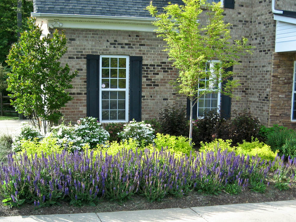 We removed the existing plant material in the front beds, added soil amendments, installed new plants along with drip irrigation, and covered the bed with mulch.